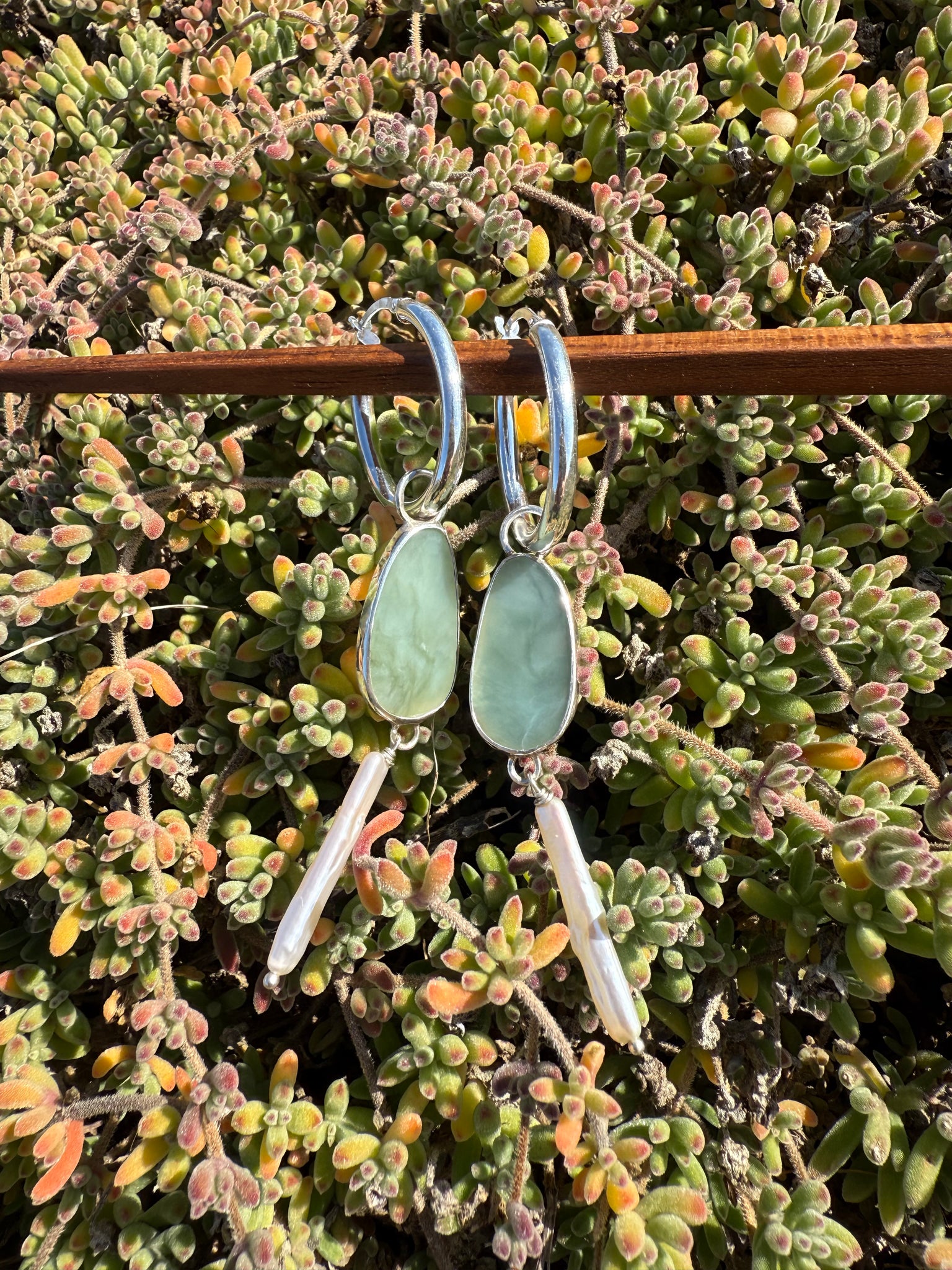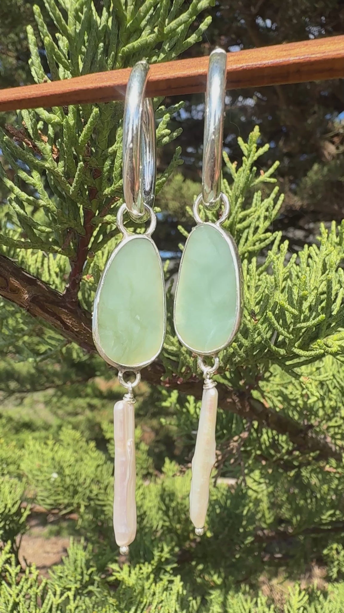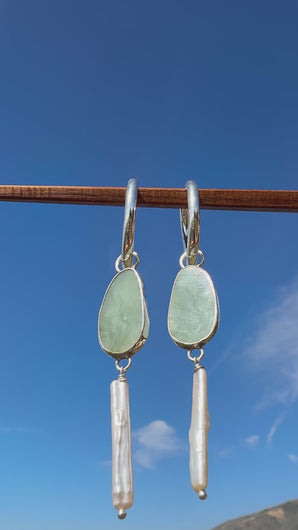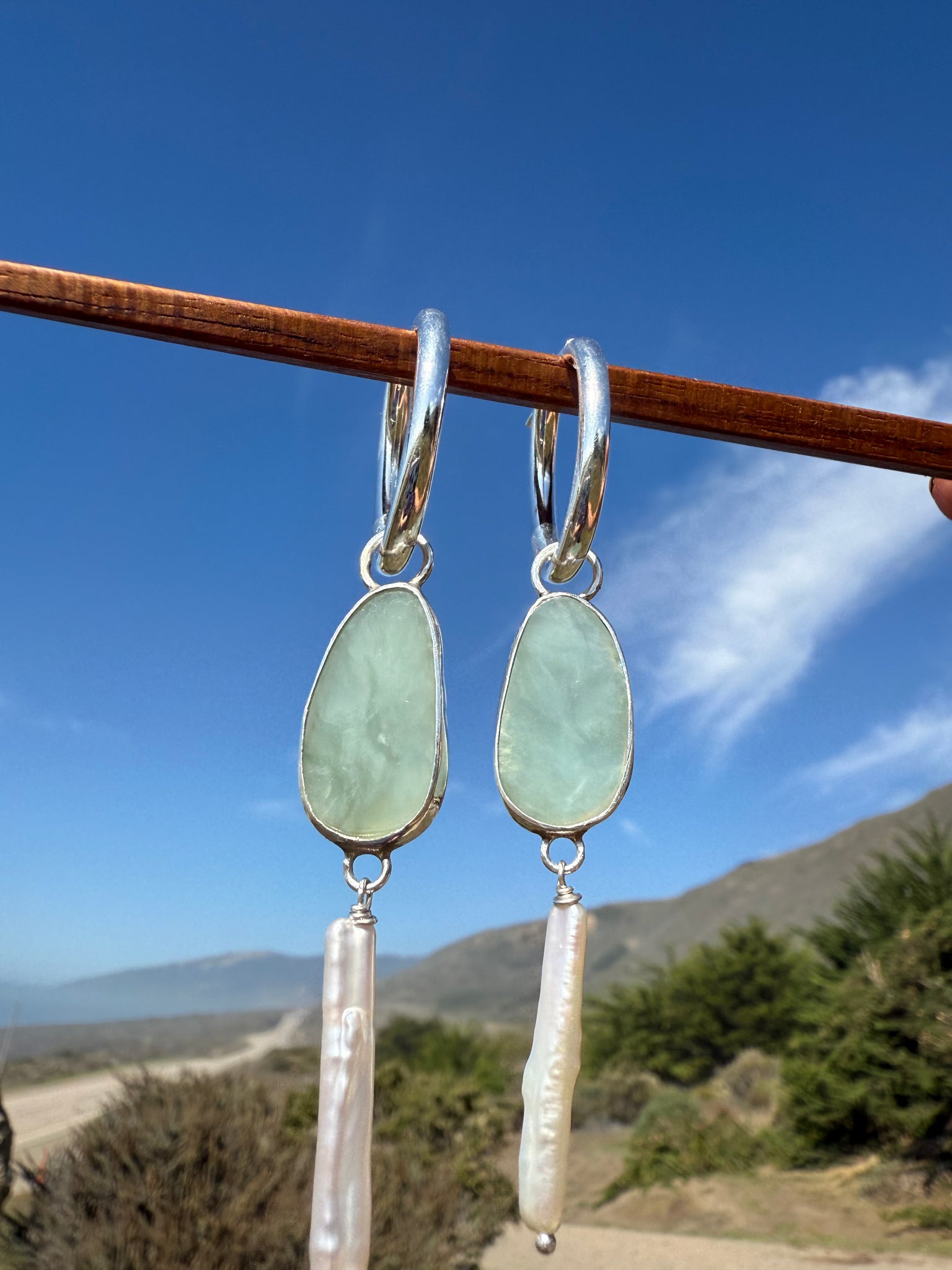 The ever desirable creamy light blue Big Sur jade set in fine and sterling silver, hung with a fresh water pearl from chunky 1” oval sterling silver hoops