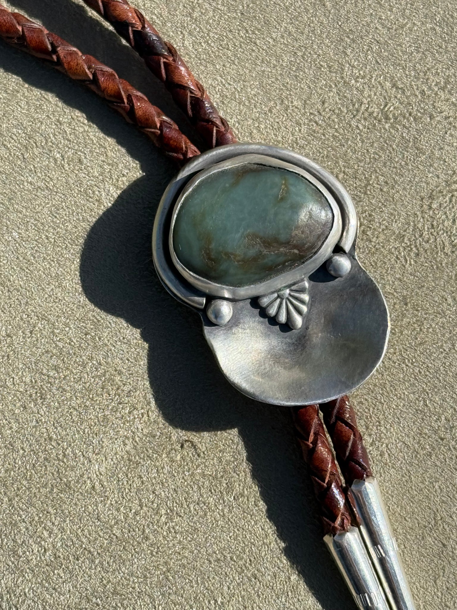 A gorgeous ocean polished and shaped light blue Big Sur gem with Vulcan highlights. Set in sterling and fine silver with a window cut out of the back to allow light to pass through the stone. One of my personal favorites!
