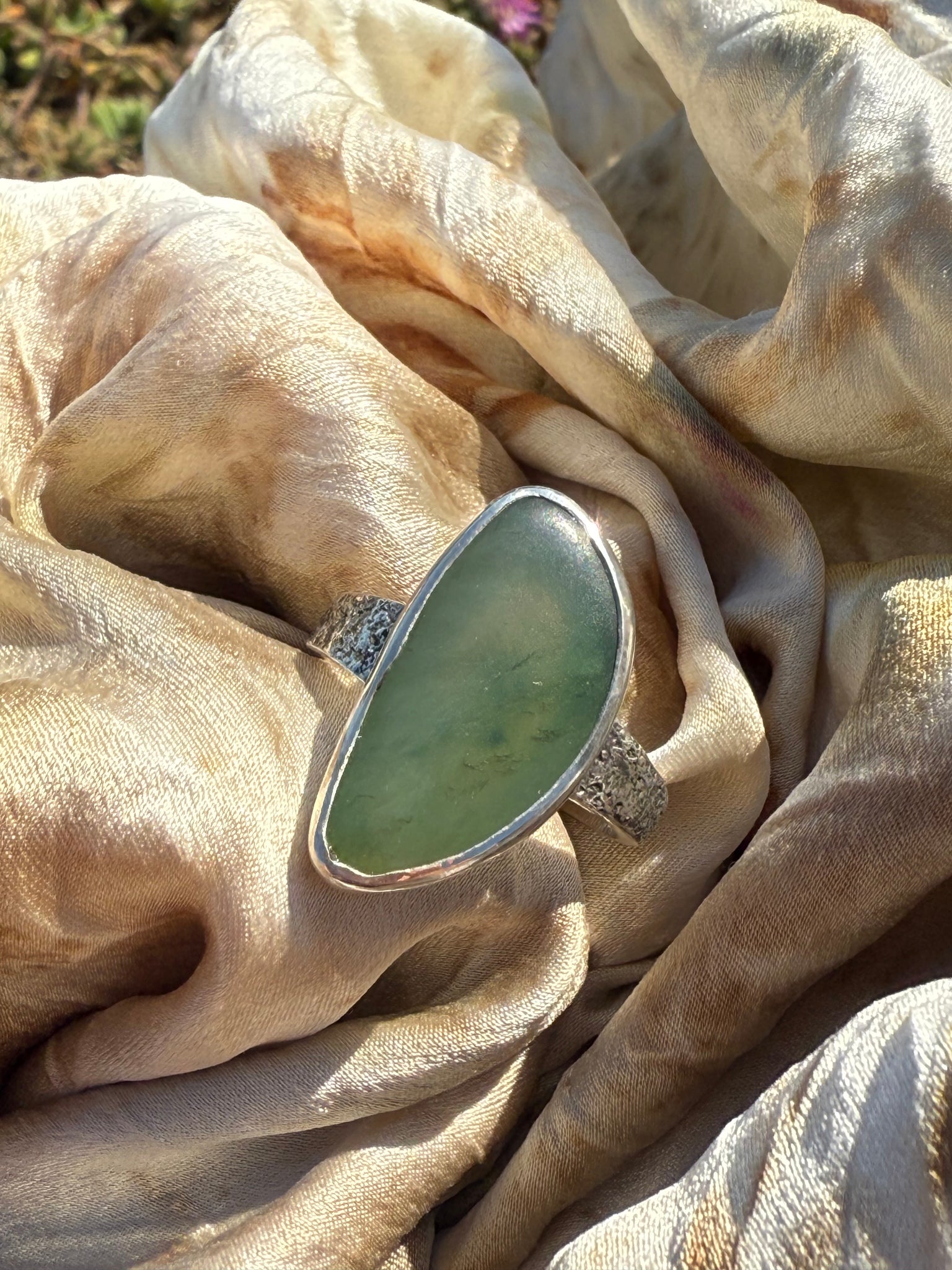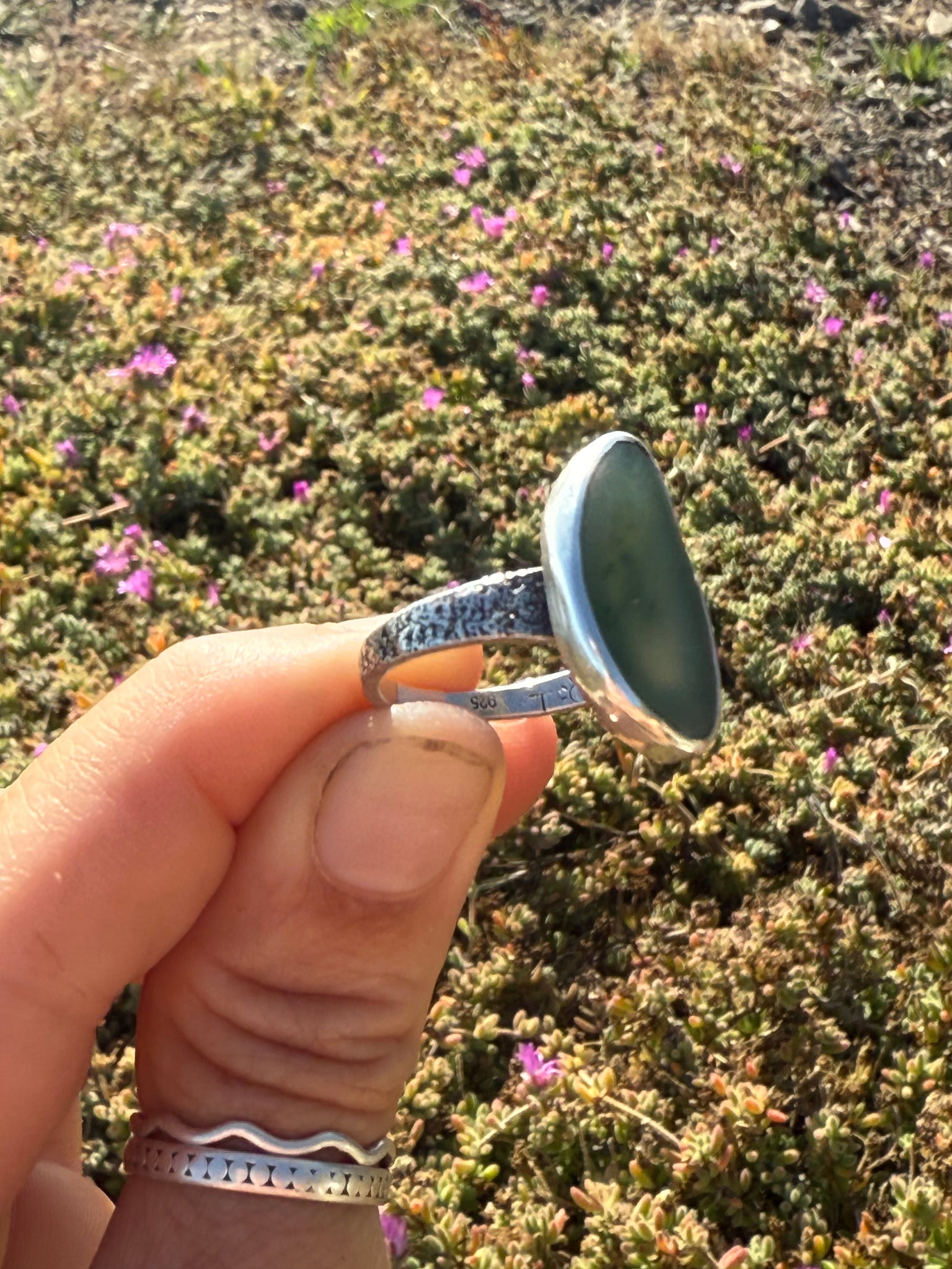Very bright Big Sur Jade set in sterling and fine silver. On a silver fused tapered ring shank.