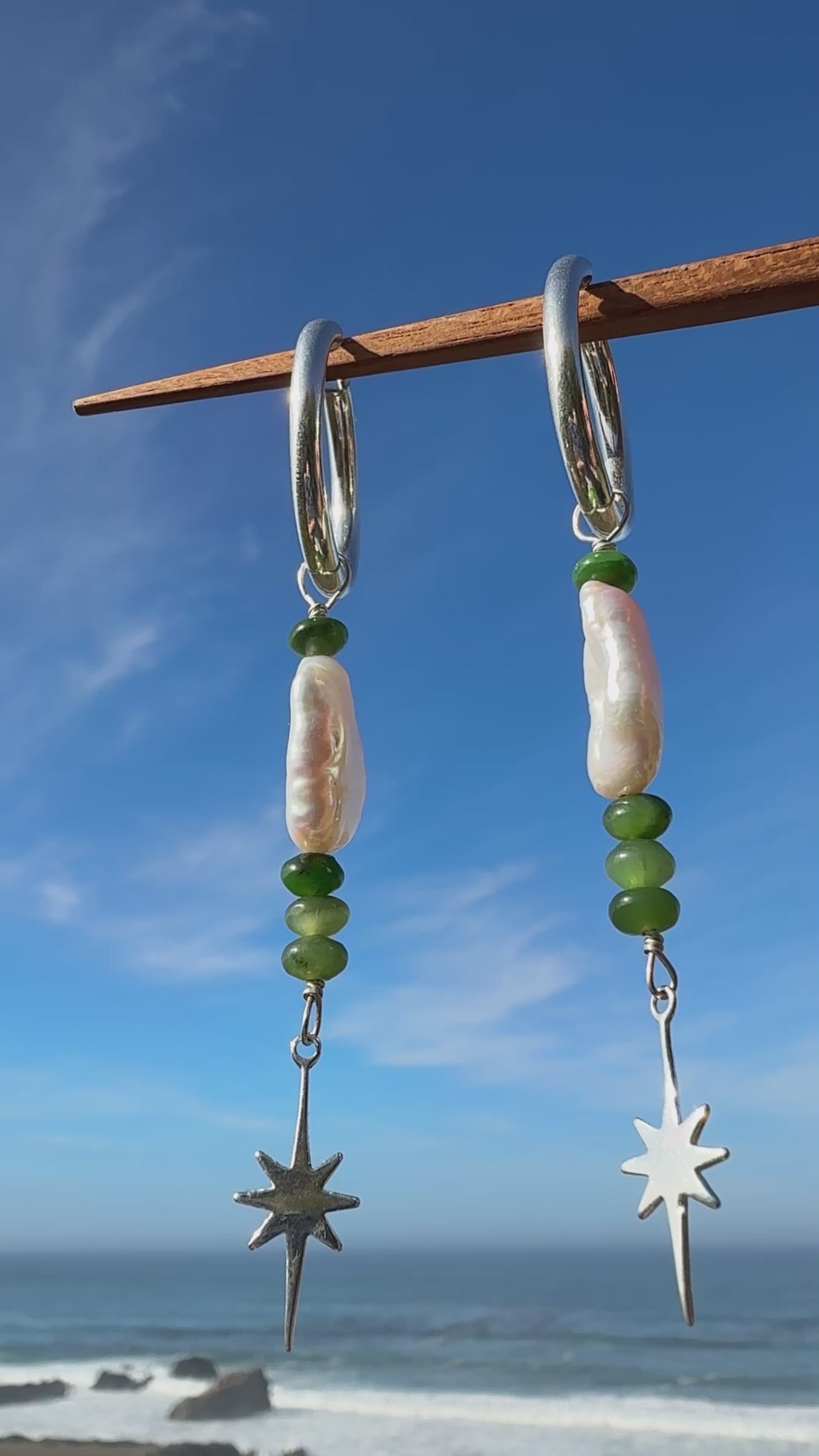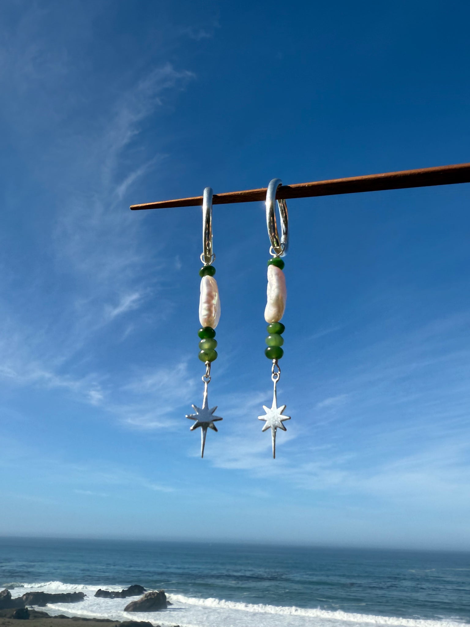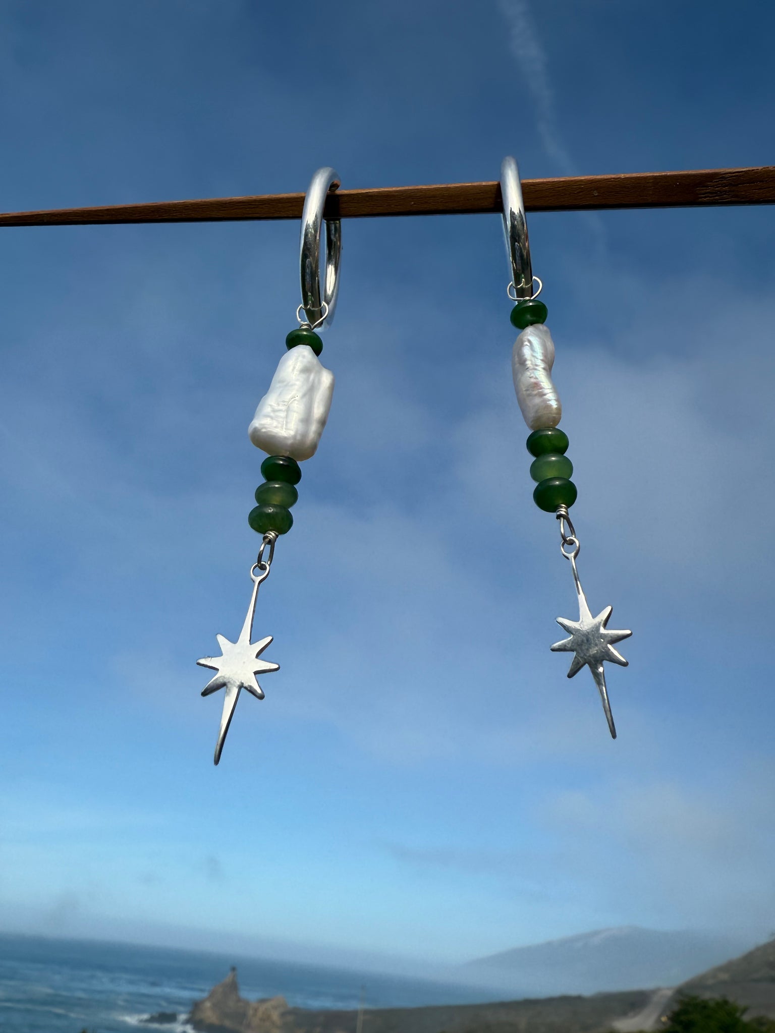 Keshi pearl + siberian jade with a celestial dangle - hung from chunky 1" oval hoops