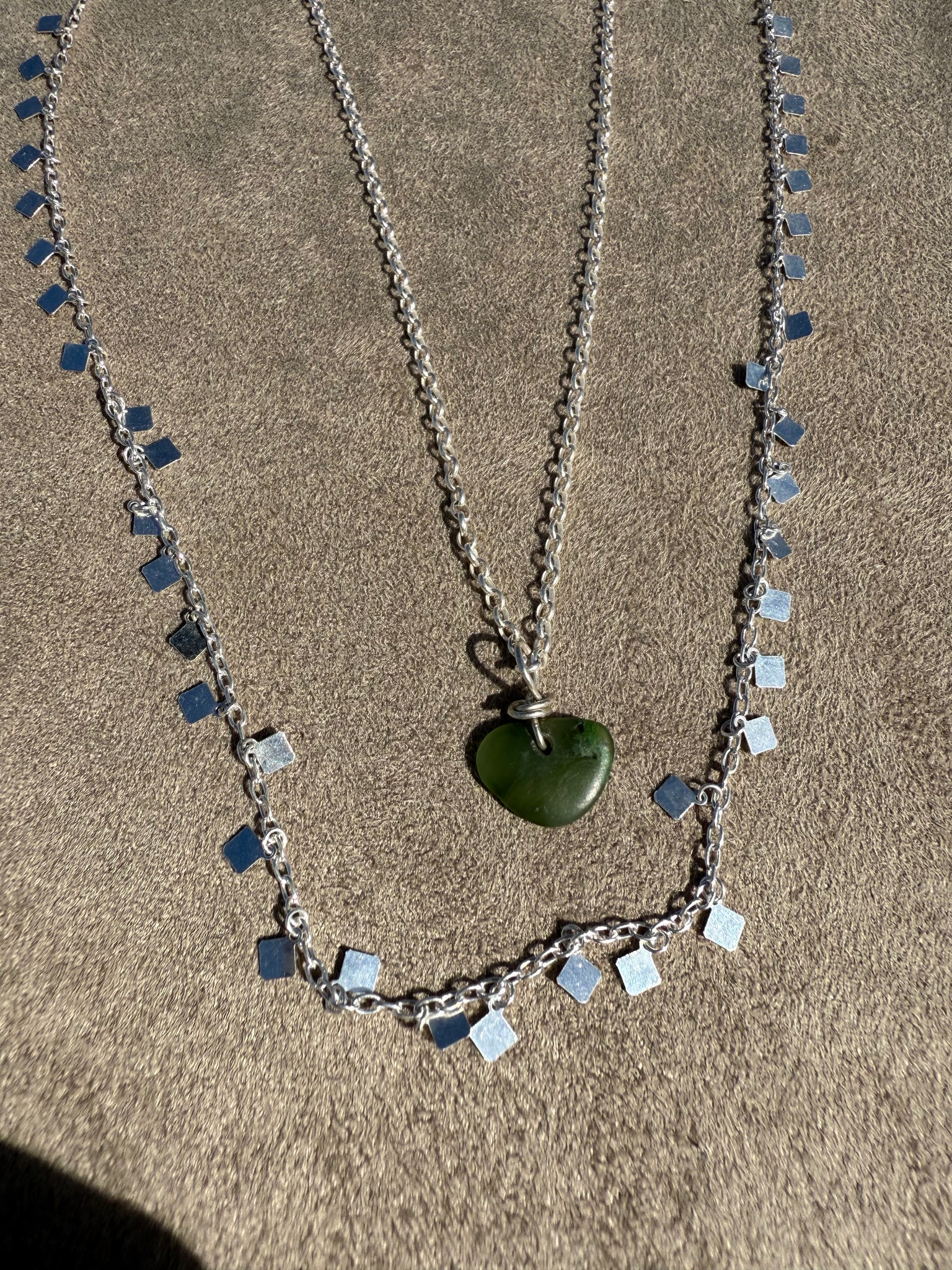 A chromium spotted, highly translucent piece of Big Sur Jade drilled and hung from a 16" sterling silver chain